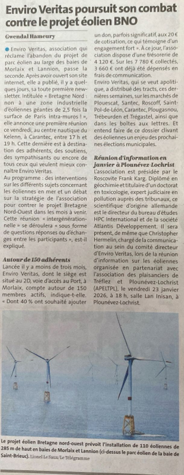 7 octobre 2025 | Rédacteur Enviro Veritas | Actualités, Presse | Aucun commentaire sur Le combat d’Enviro Veritas : l’association qui dénonce l’impact d’un parc de 110 éoliennes géantes au large de Morlaix et Lannion