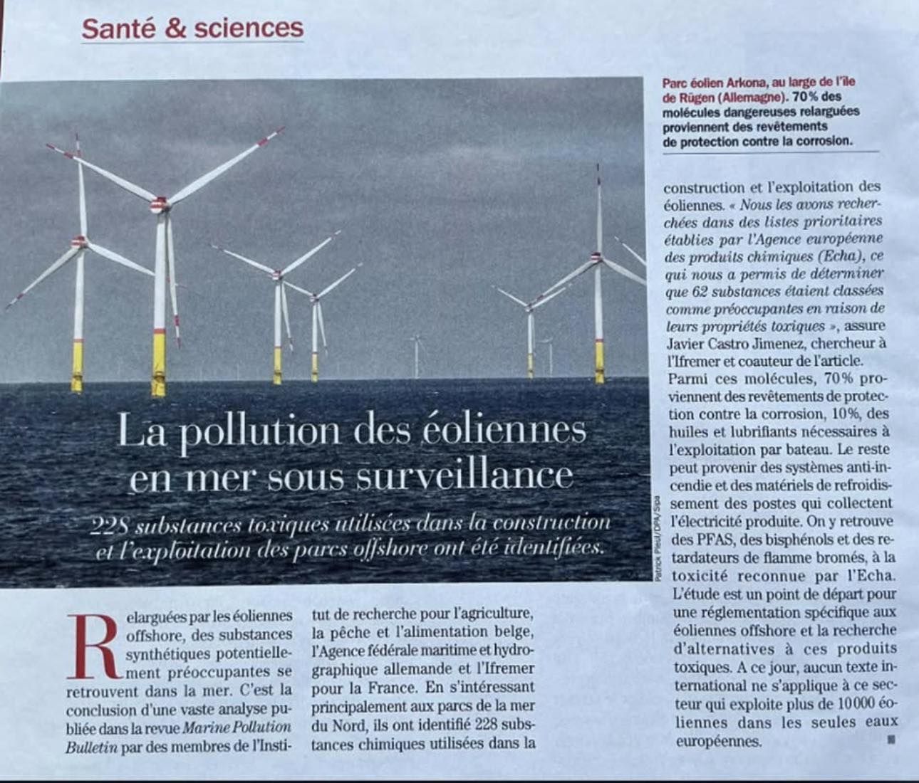 Une étude récente a ainsi identifié 228 substances liées à la construction et à l’exploitation des parcs éoliens offshore, dont certaines sont potentiellement toxiques.