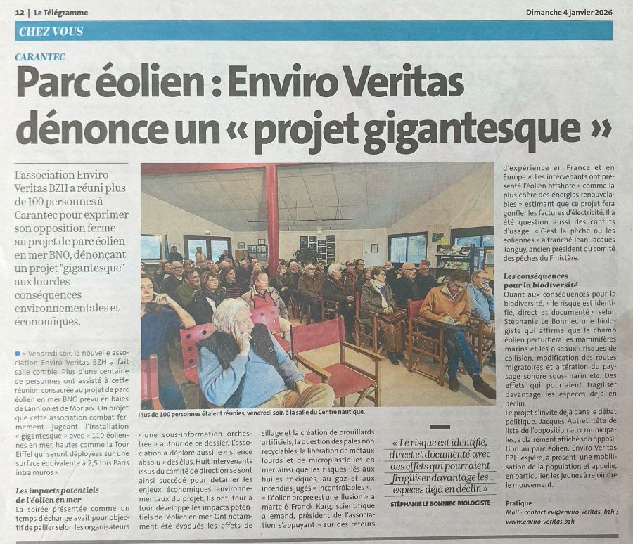 Le 23 Janvier 2026, l’association Enviro Veritas à l’invitation de l’APELTPL, vous invite à une réunion d’information salle Lan Inisan à Plounévez-Lochrist sur le projet d’implantation de 110 éoliennes devant nos côtes.